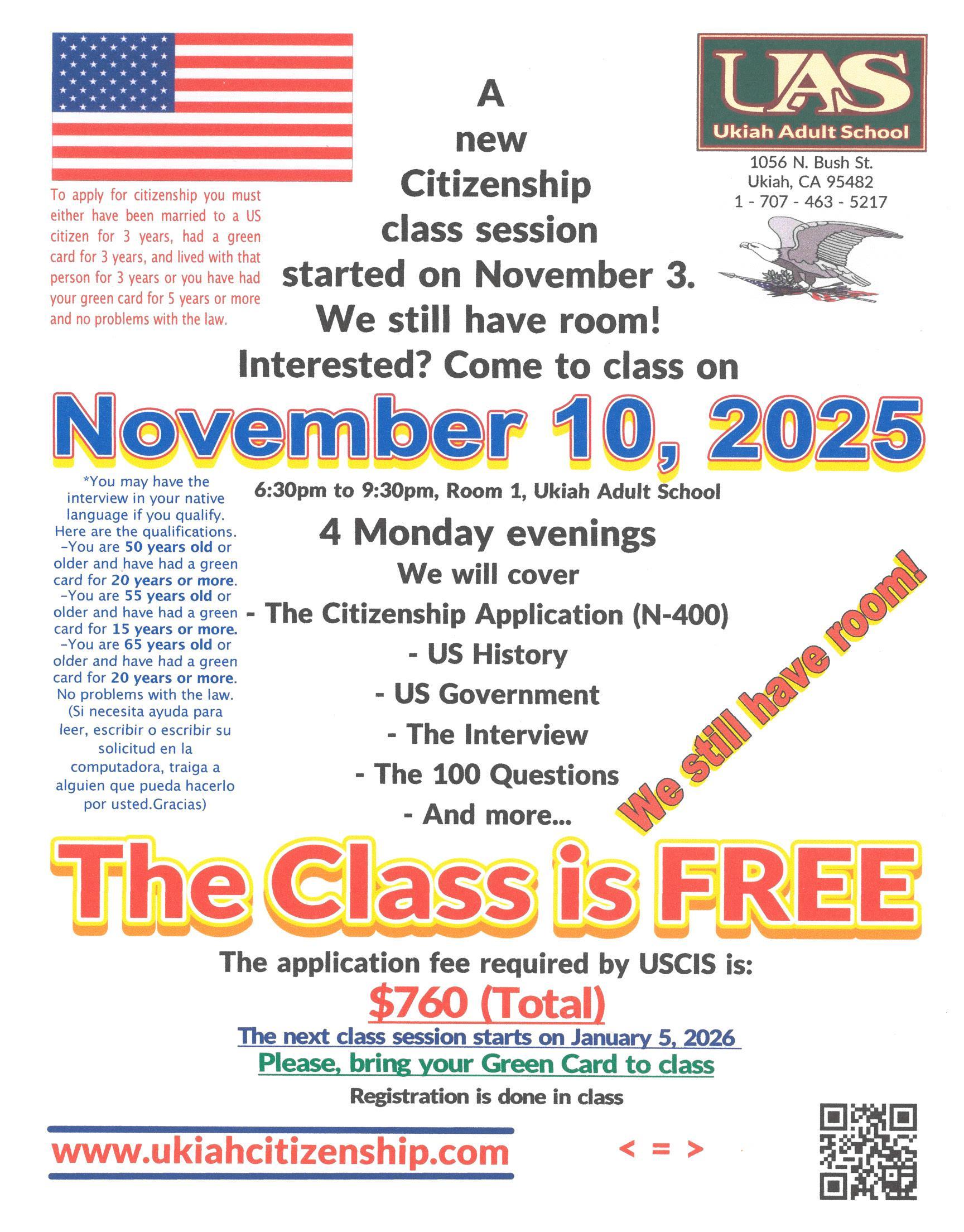 Look here for information on FREE Citizenship classes. https://adultschool.uusd.net/apps/pages/index.jsp?uREC_ID=581167&type=d&pREC_ID=1072960