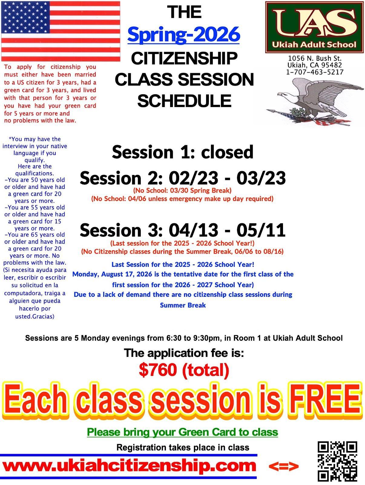Ukiah Adult School offers fee FREE Citizenship class sessions on Monday evenings.